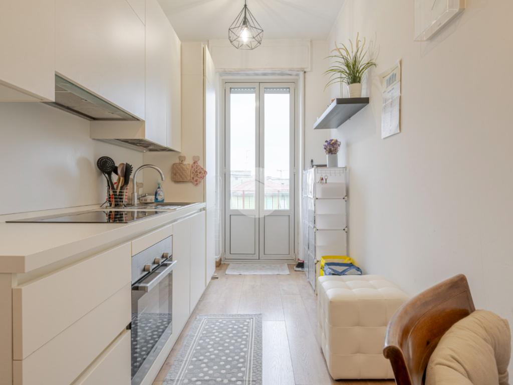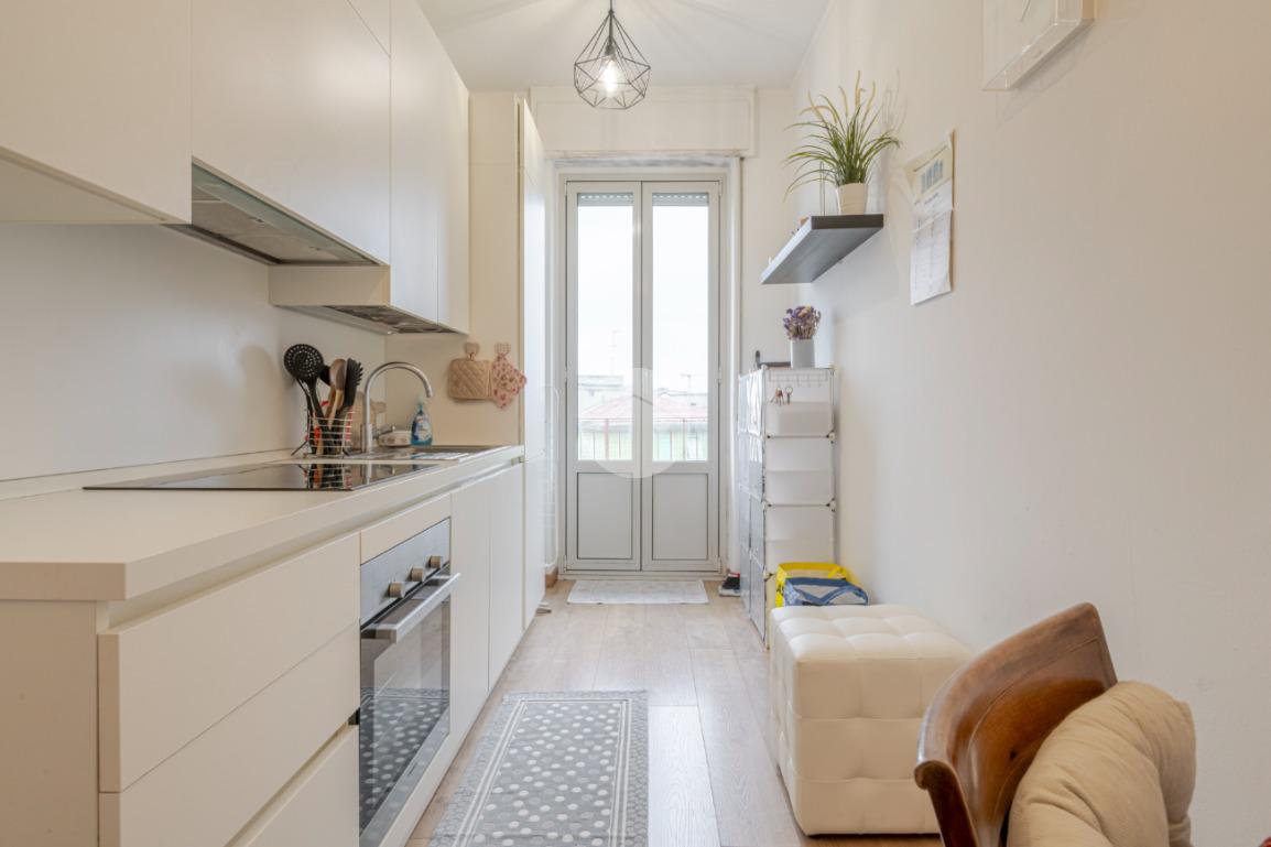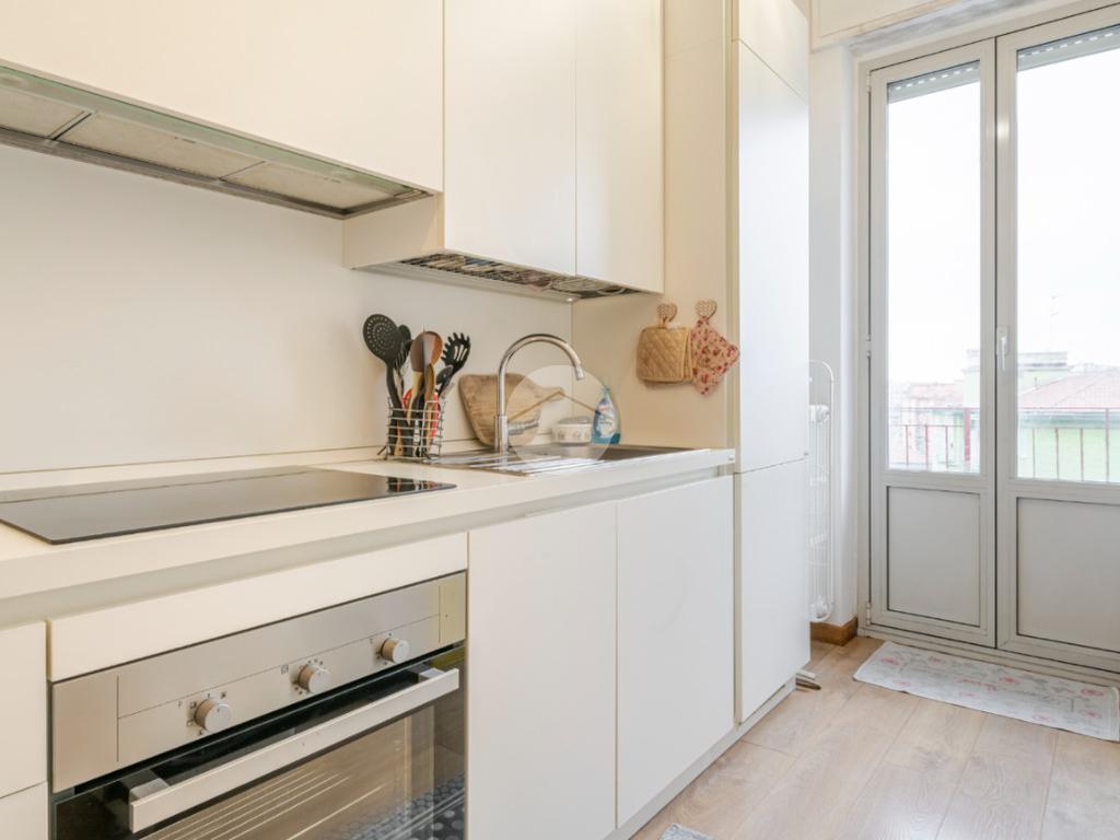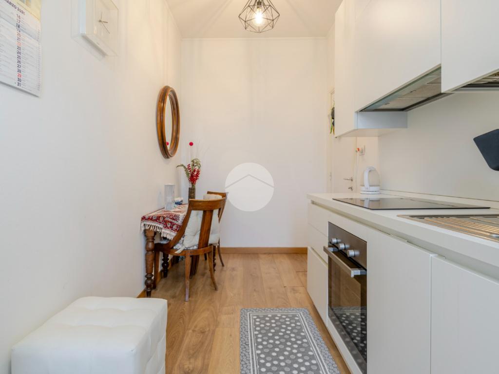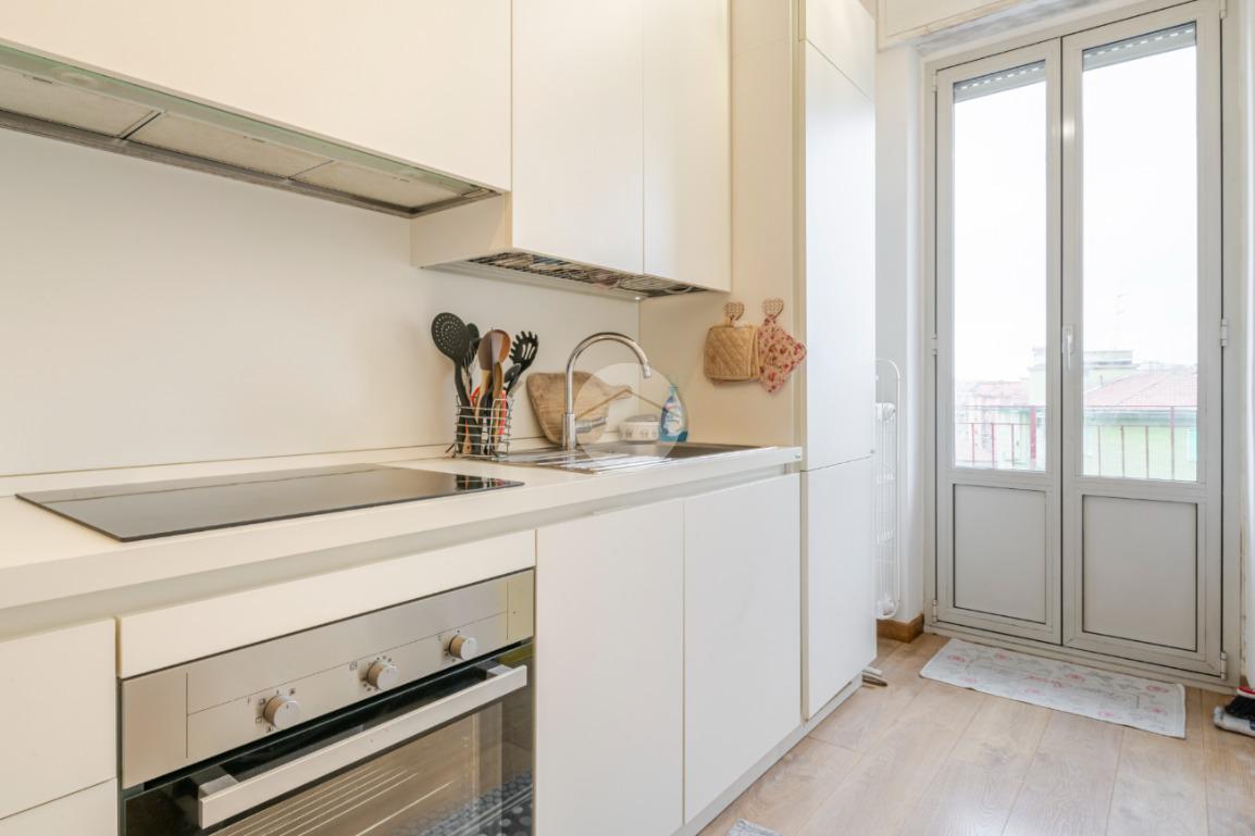 Procedendo da destra verso sinistra troviamo la cucina semi-abitabile, dotata di piano a induzione e con accesso diretto al terrazzo, caratteristica particolarmente apprezzata che consente di vivere lo spazio esterno anche per colazioni o momenti di relax, con tranquillo affaccio sulla corte interna.