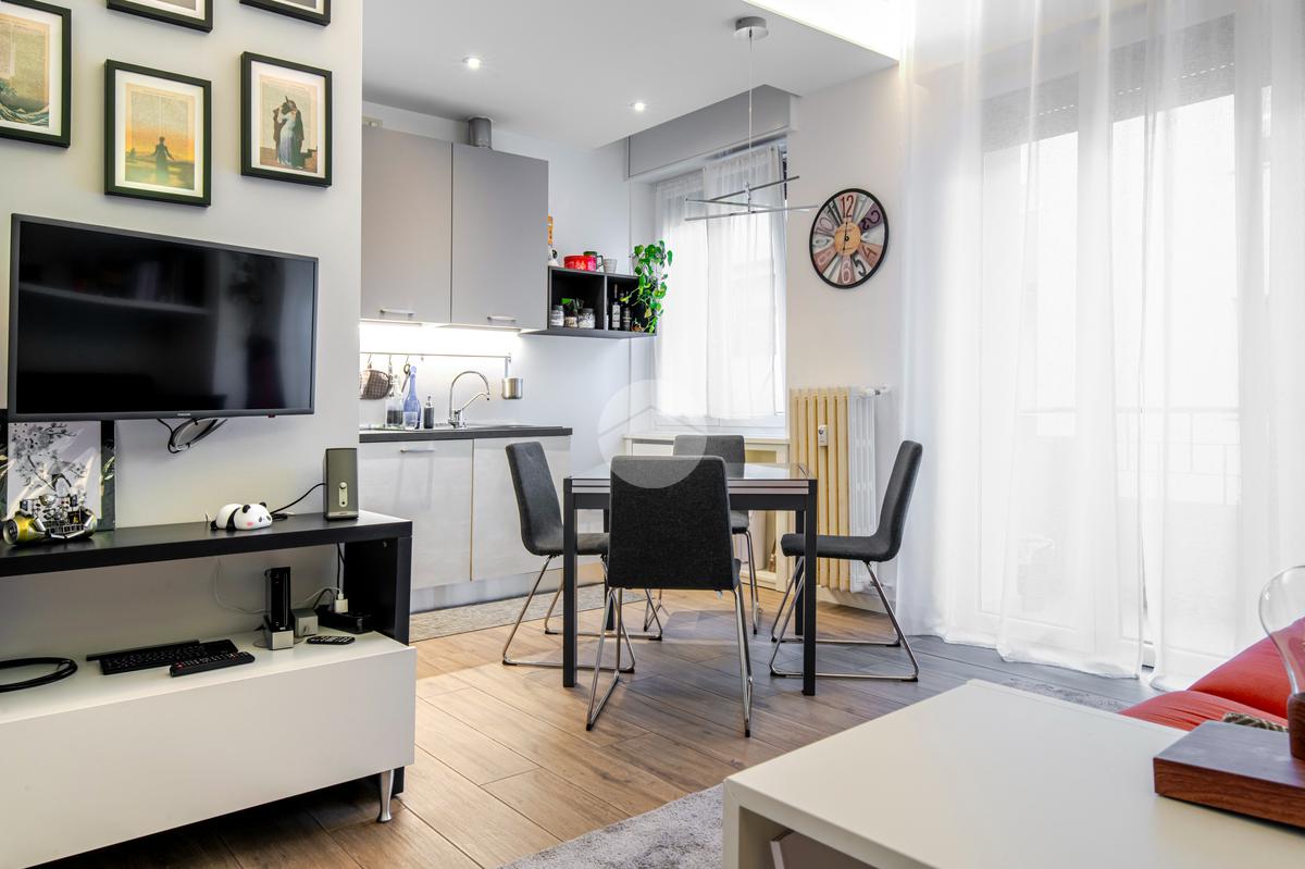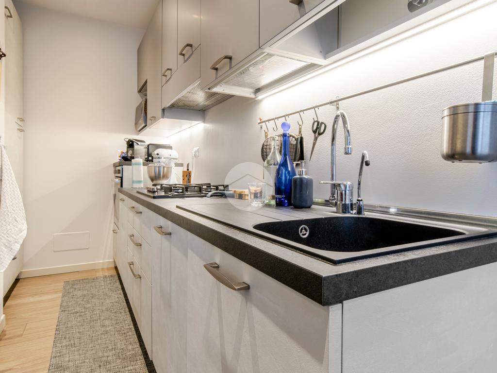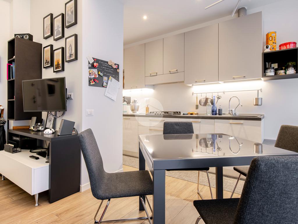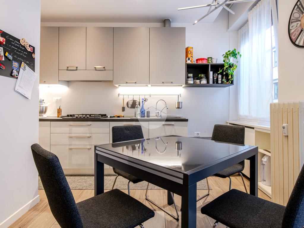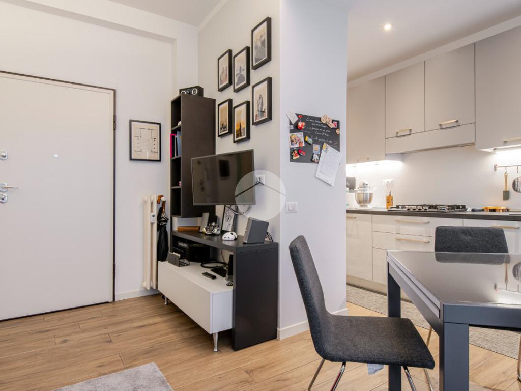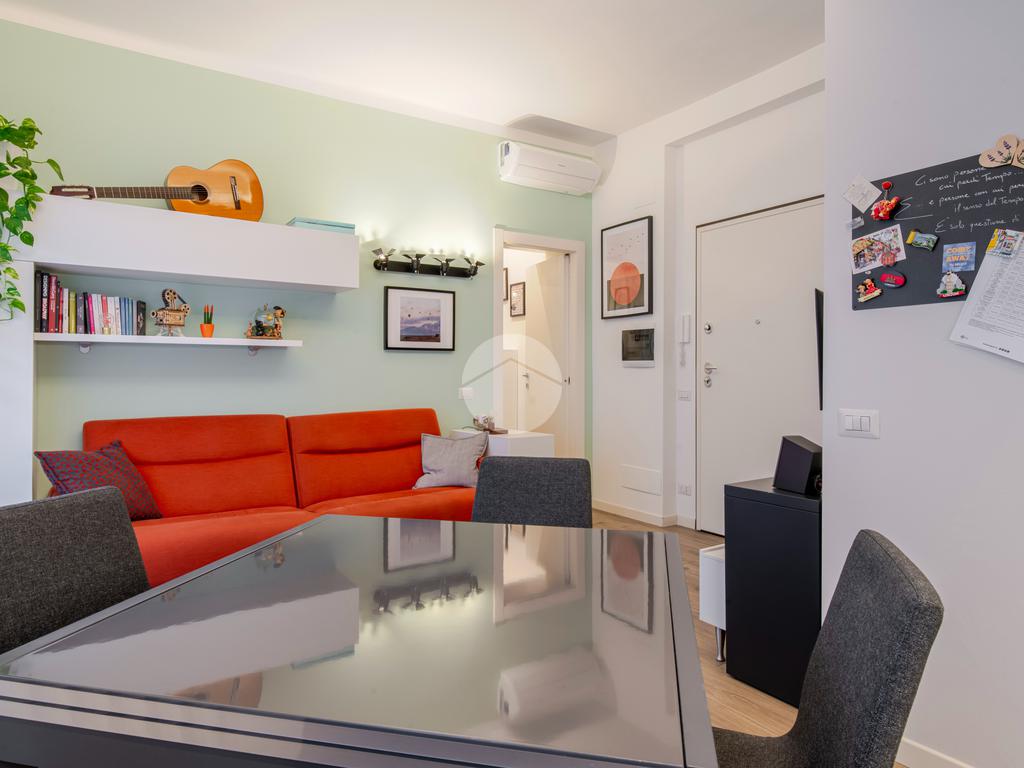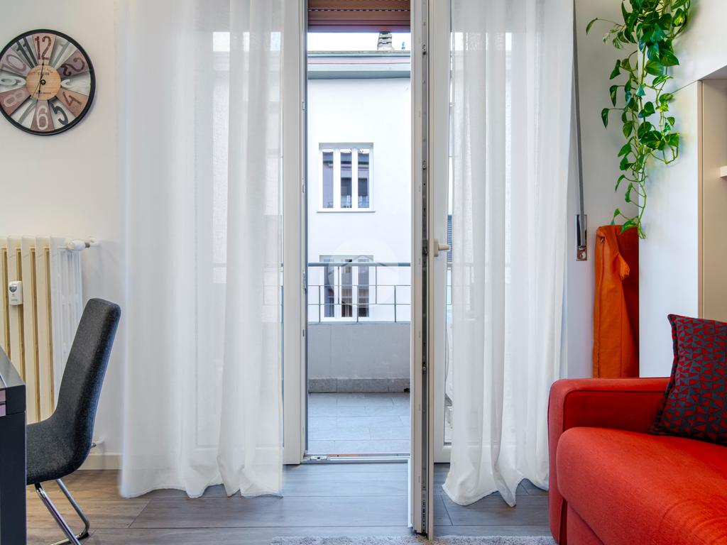 L’appartamento risulta essere così composto : l’ingresso si apre direttamente nella zona living con cucina a vista, valorizzata da un’ampia porta finestra che conduce al balcone, con piacevole affaccio su corte interna.