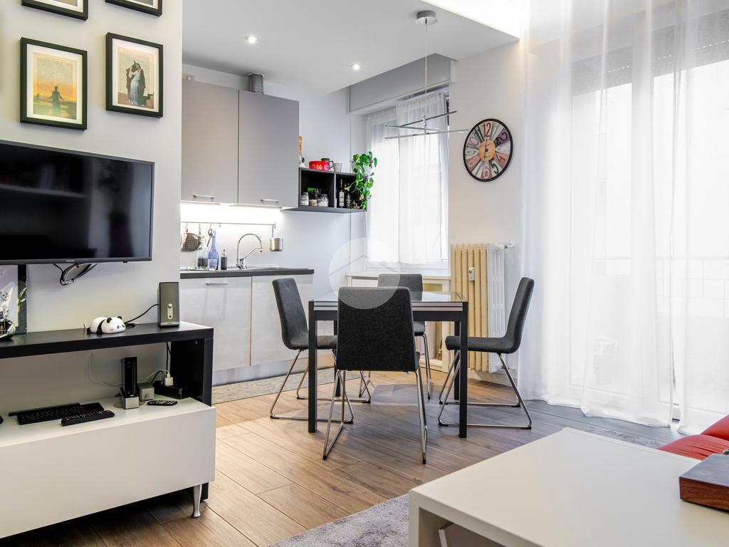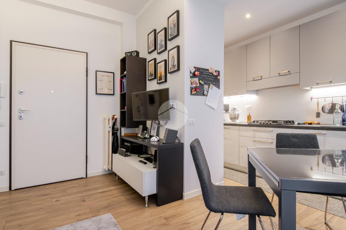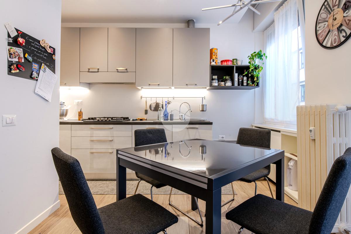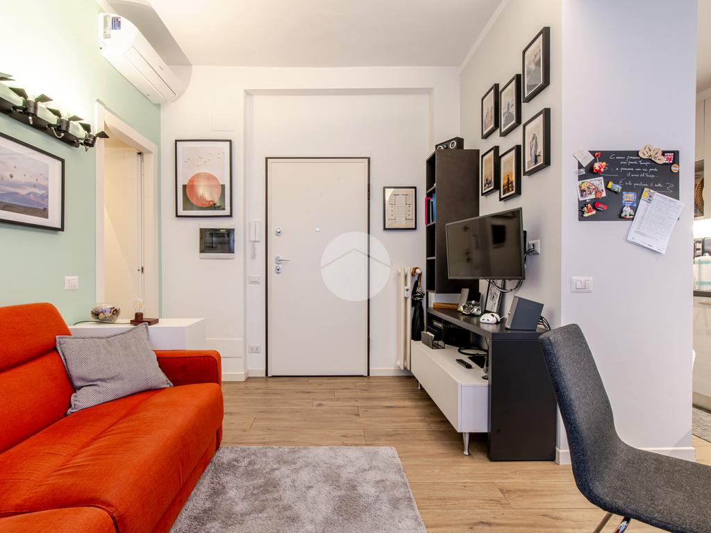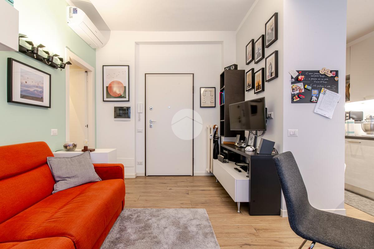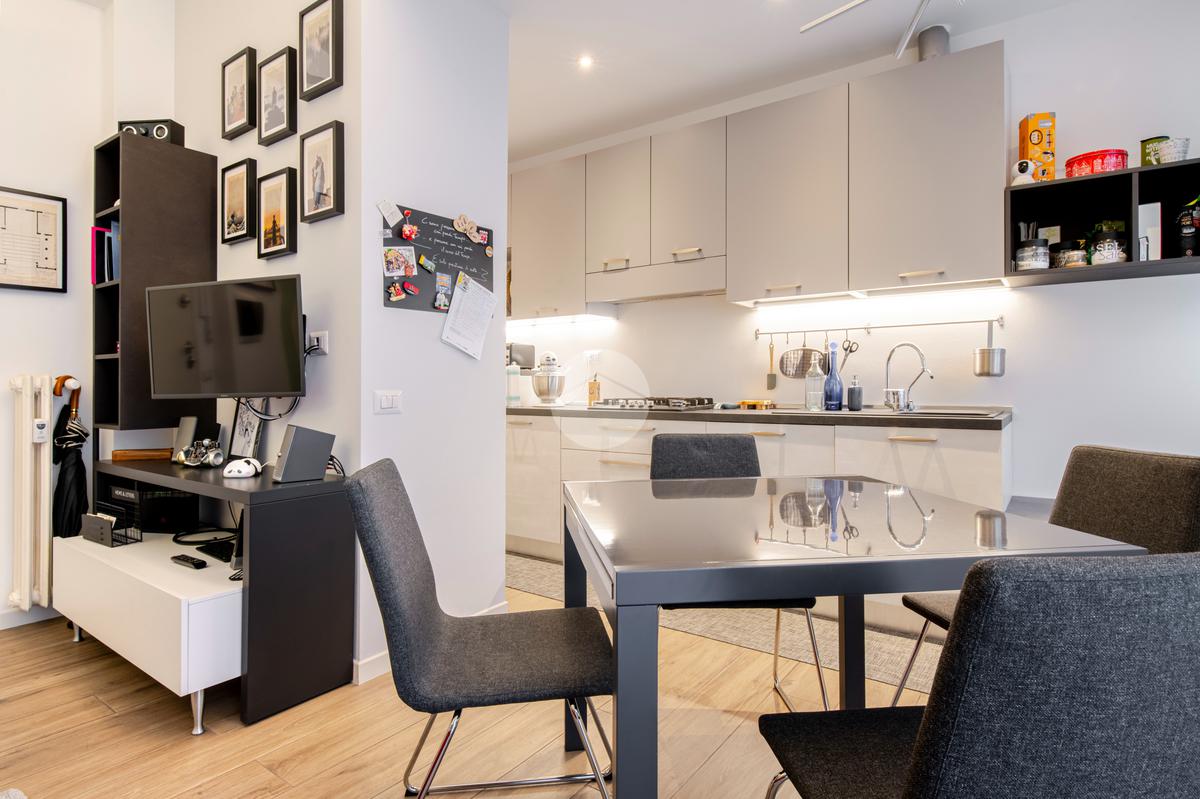 L’appartamento risulta essere così composto : l’ingresso si apre direttamente nella zona living con cucina a vista, valorizzata da un’ampia porta finestra che conduce al balcone, con piacevole affaccio su corte interna.