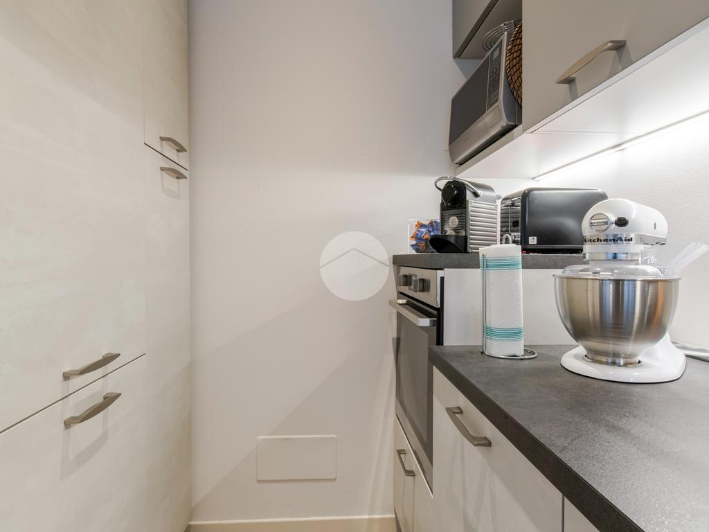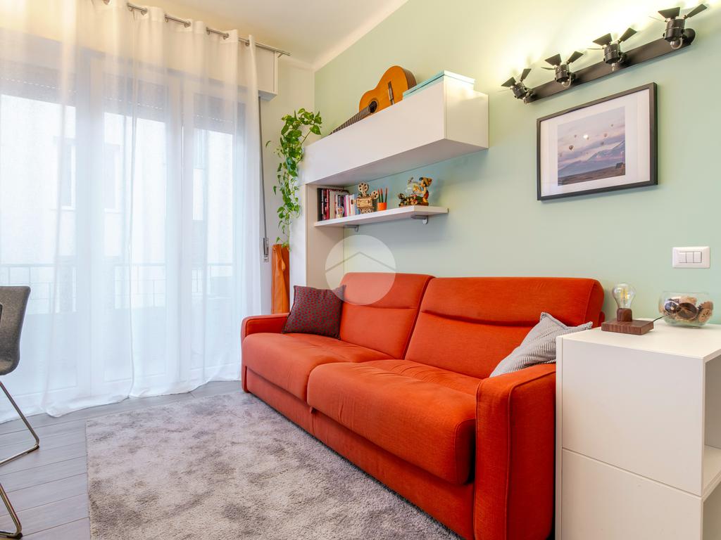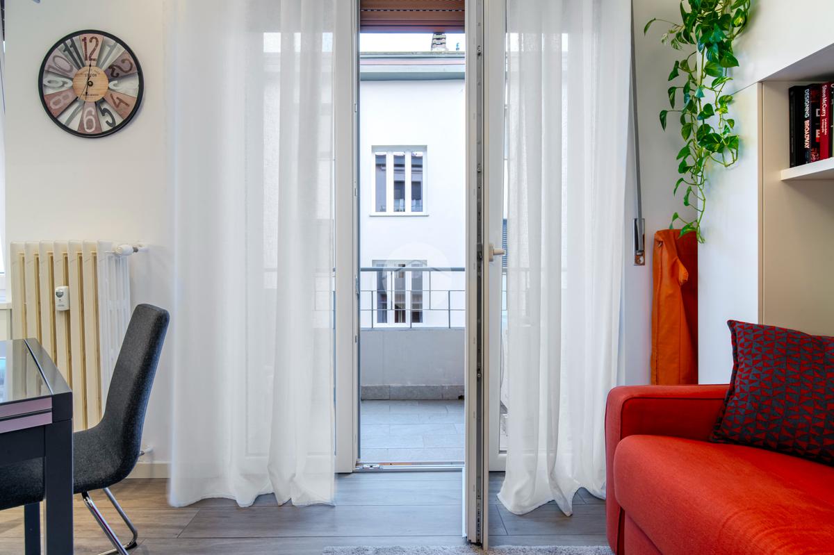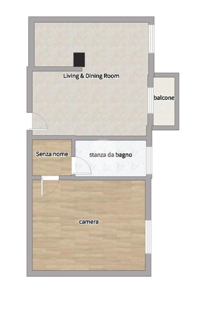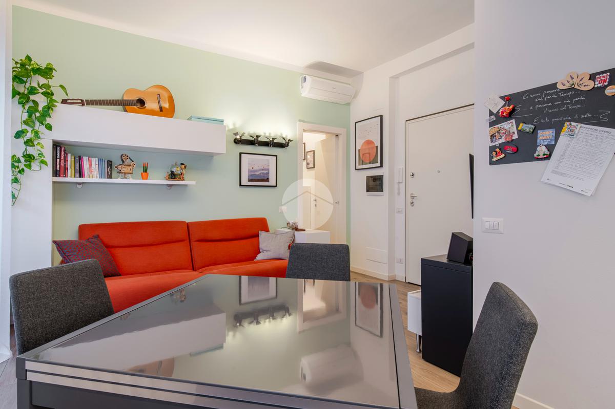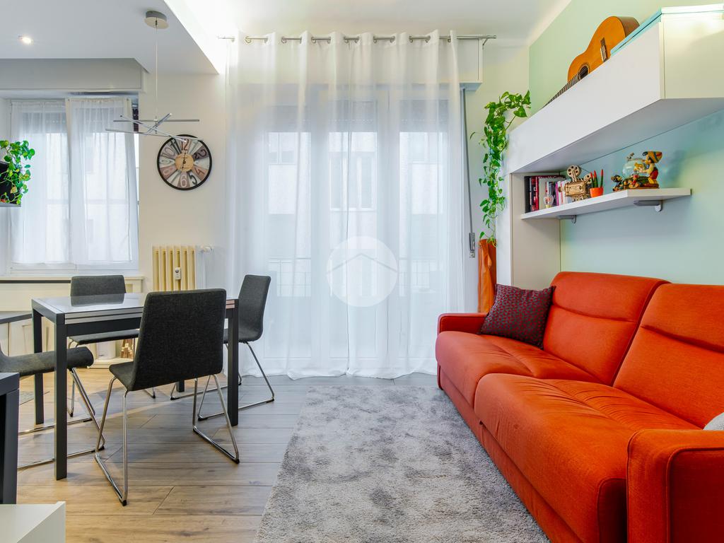 L’appartamento risulta essere così composto : l’ingresso si apre direttamente nella zona living con cucina a vista, valorizzata da un’ampia porta finestra che conduce al balcone, con piacevole affaccio su corte interna.