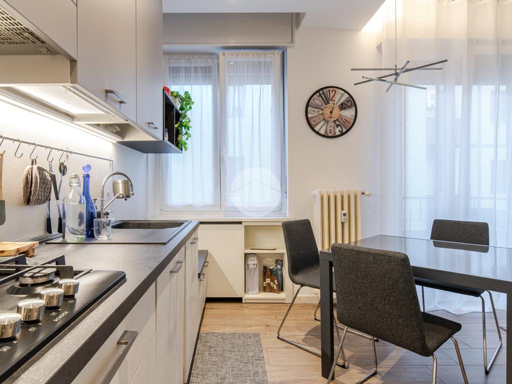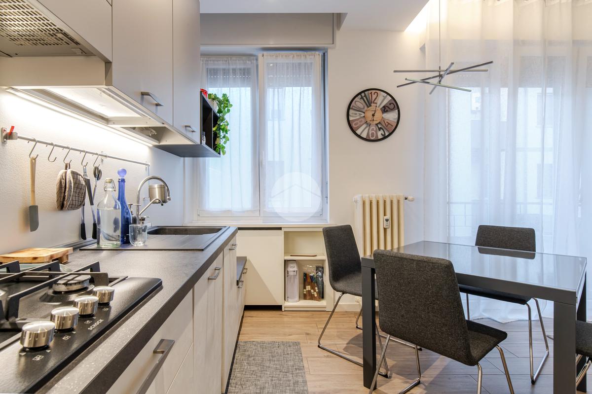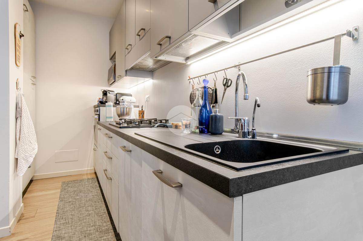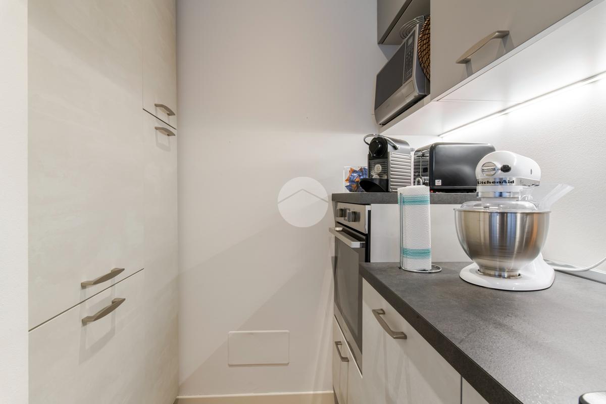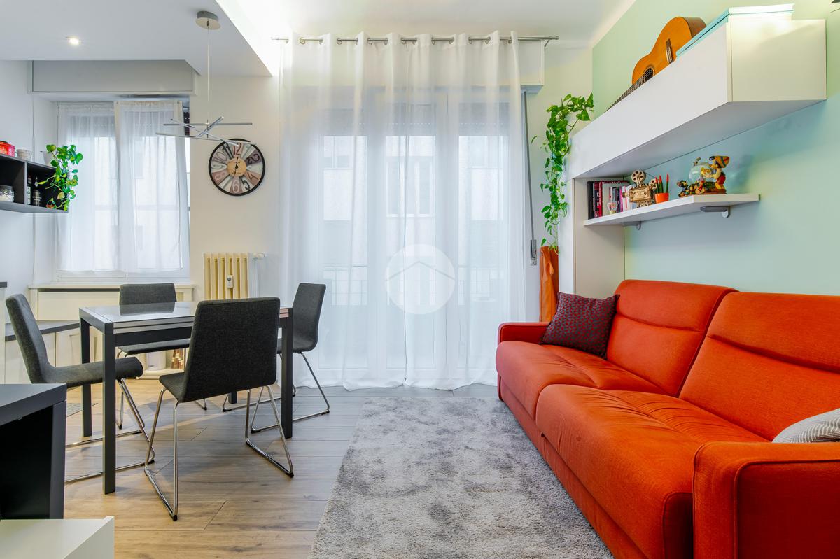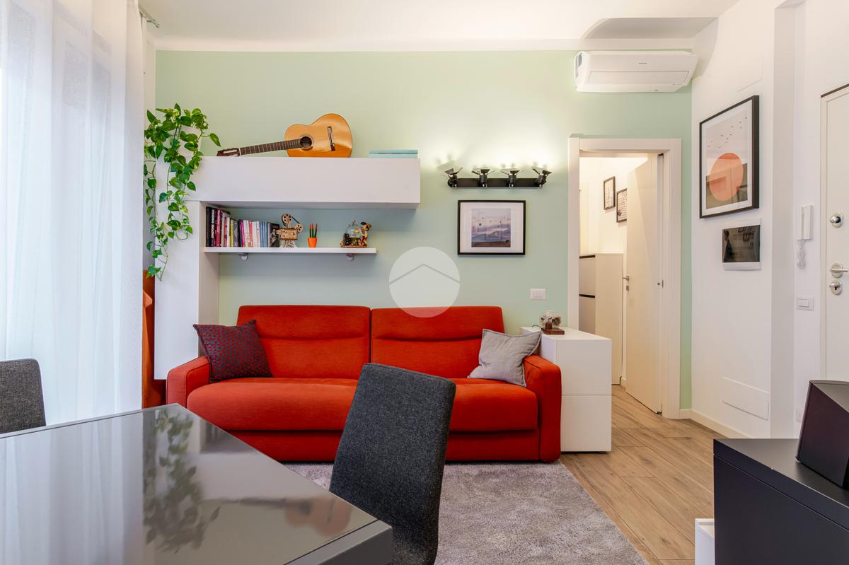 L’appartamento risulta essere così composto : l’ingresso si apre direttamente nella zona living con cucina a vista, valorizzata da un’ampia porta finestra che conduce al balcone, con piacevole affaccio su corte interna.
