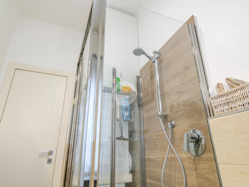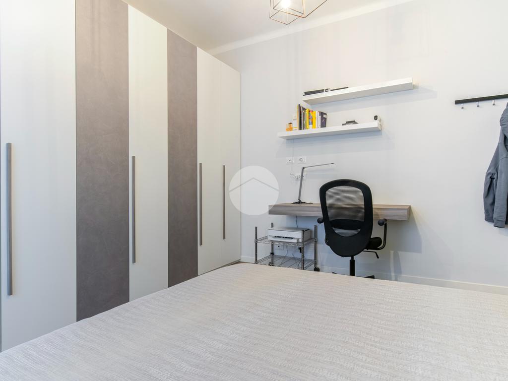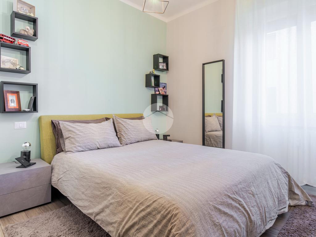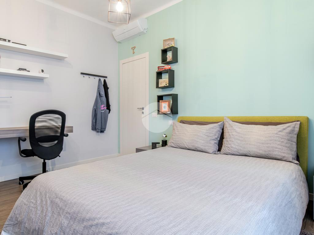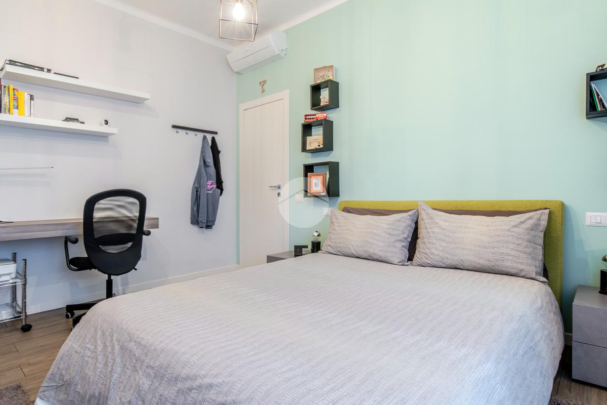 Un disimpegno introduce alla zona notte, composta da una spaziosa camera matrimoniale, caratterizzata dalla stessa favorevole esposizione della zona giorno, e da un bagno finestrato, completo di moderno box doccia.
