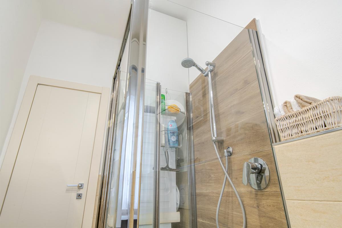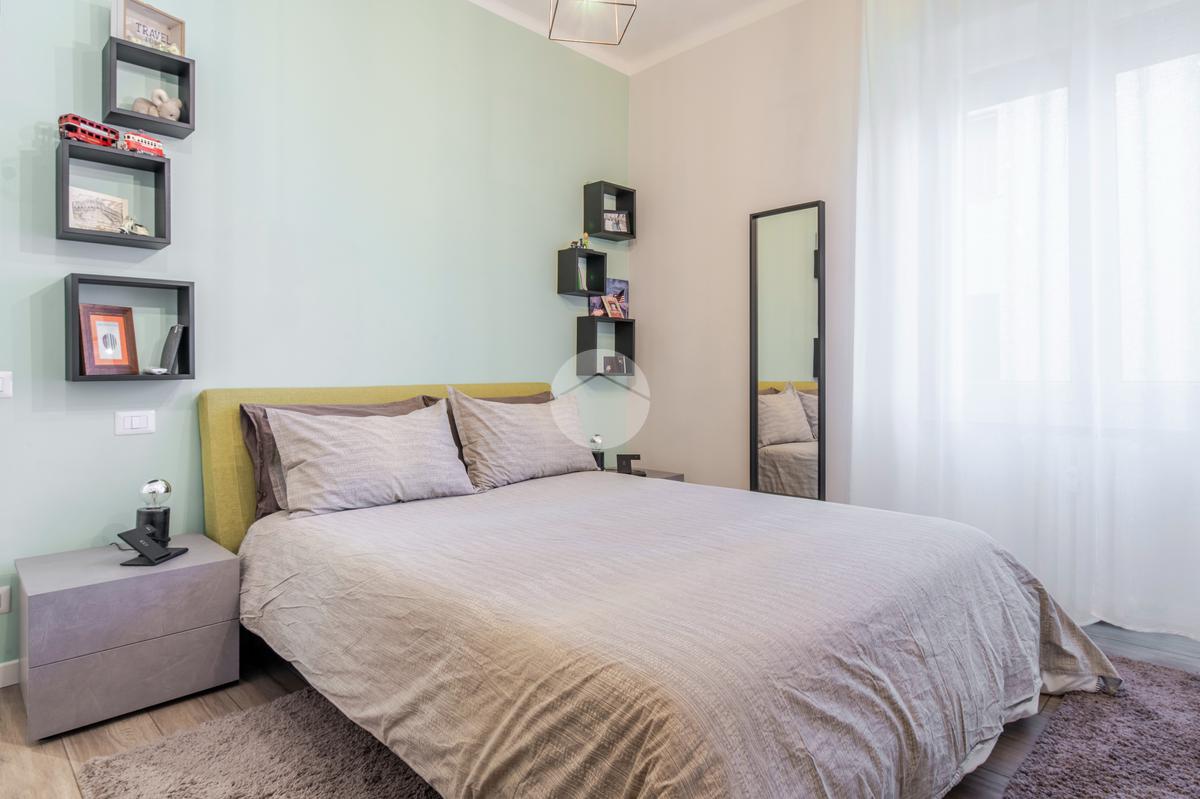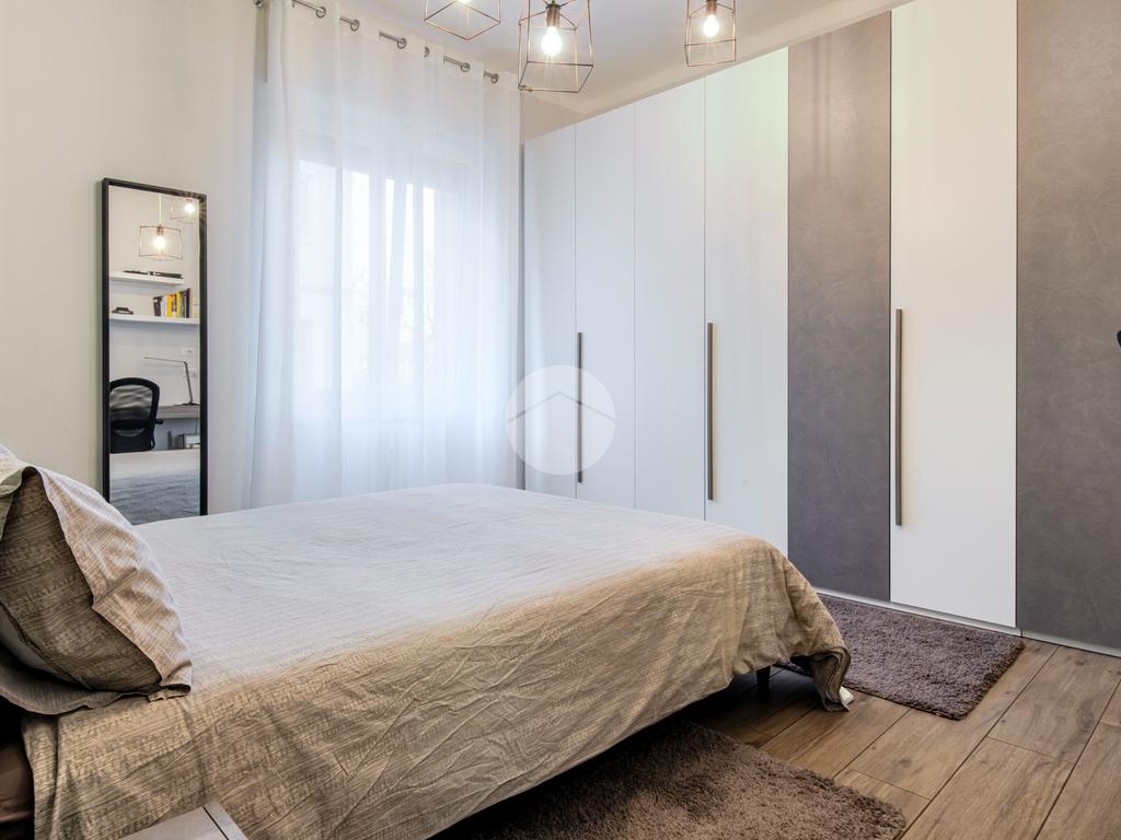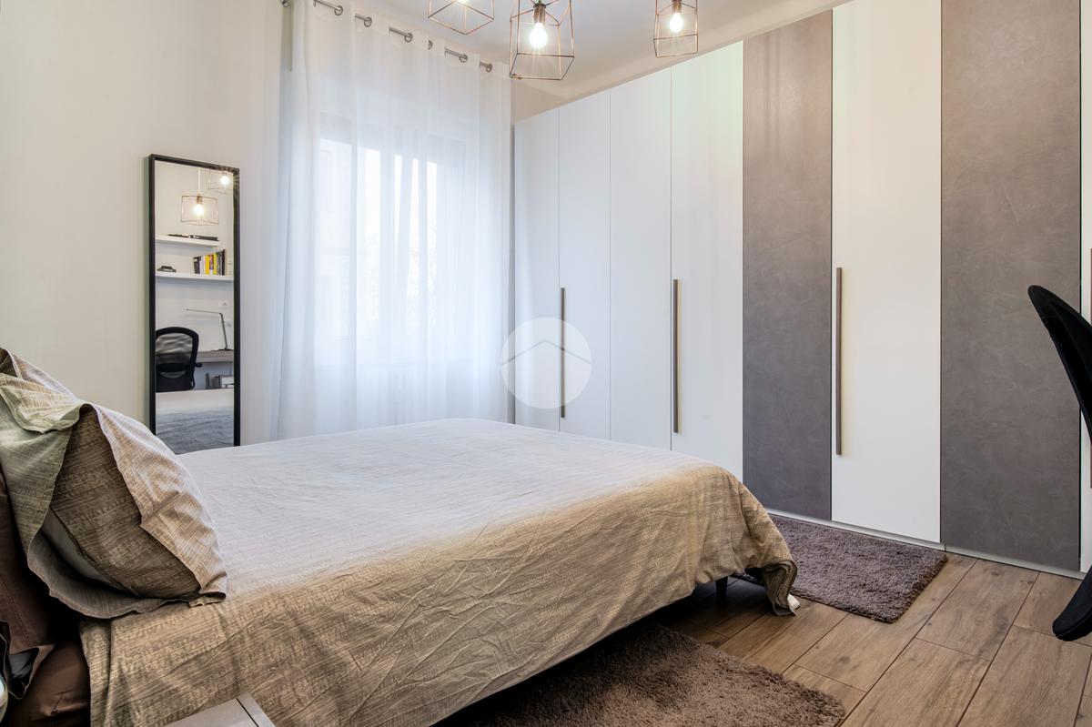 Un disimpegno introduce alla zona notte, composta da una spaziosa camera matrimoniale, caratterizzata dalla stessa favorevole esposizione della zona giorno, e da un bagno finestrato, completo di moderno box doccia.